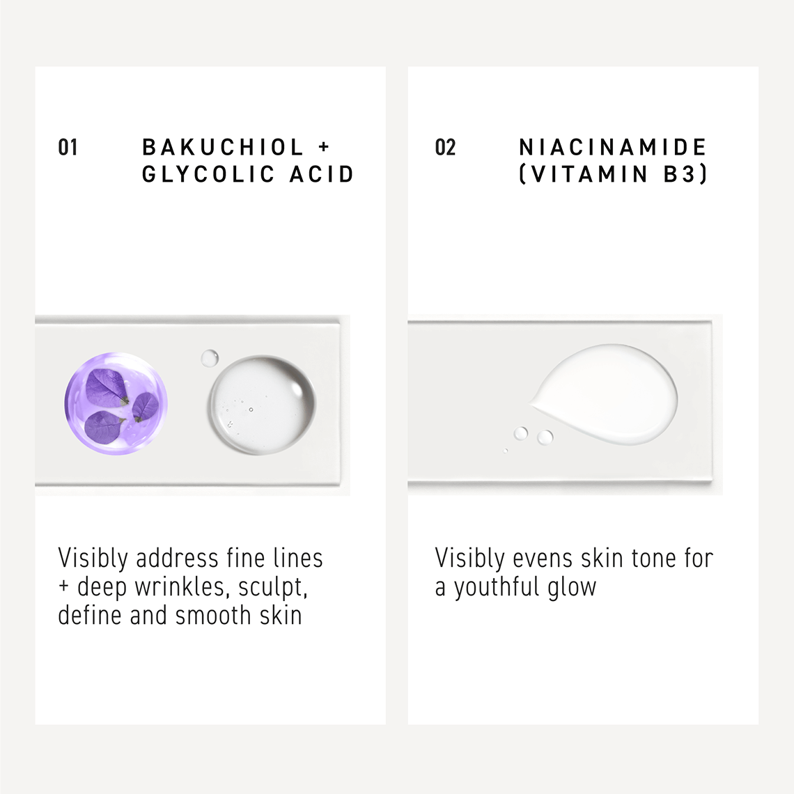 Redefine Overnight Restorative Cream contains Backuchiol, a natural alternative to Retinol, plus Glycolic Acid to revitalise skin's surface for more refined skin texture and reduces the appearance of lines + deep wrinkles. Our night cream does not contain collagen.