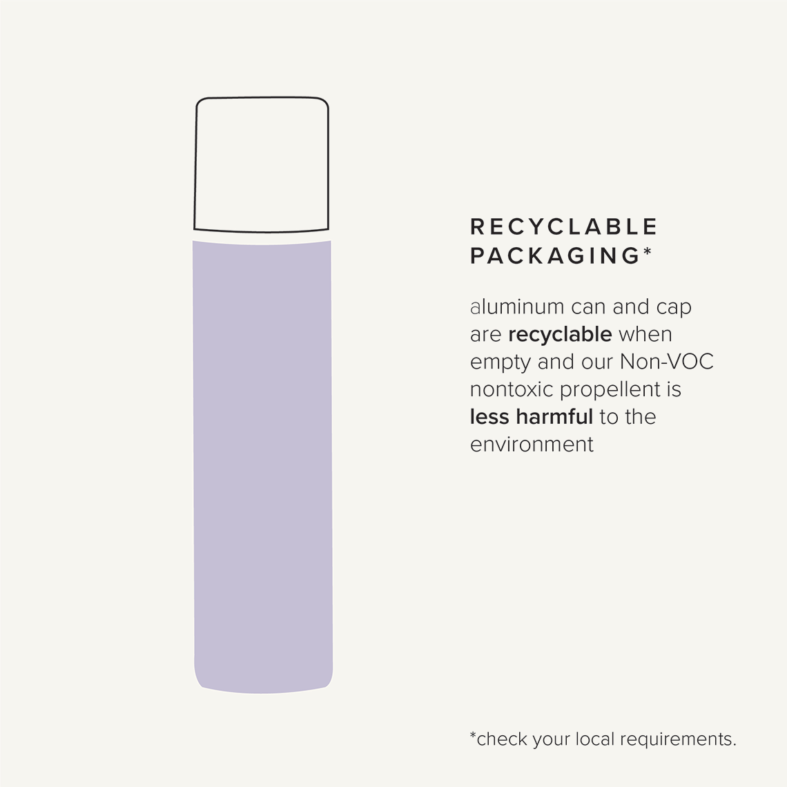 Aluminium can and cap are recyclable when empty and our Non-VOC nontoxic propellant is less harmful to the environment. Always check with your local guidelines.